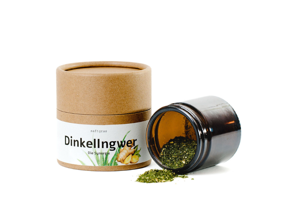 Herkunft: Weizengras Dinkel aus Eigenanbau, Ingwer, vorwiegend aus Eigen- oder deutschem Anbau